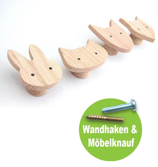 Tier Wandhaken & Schubladengriffe aus Holz. Tierische Haken aus Eiche in Scandinavian-Design. Hase Hund Katze Fox
