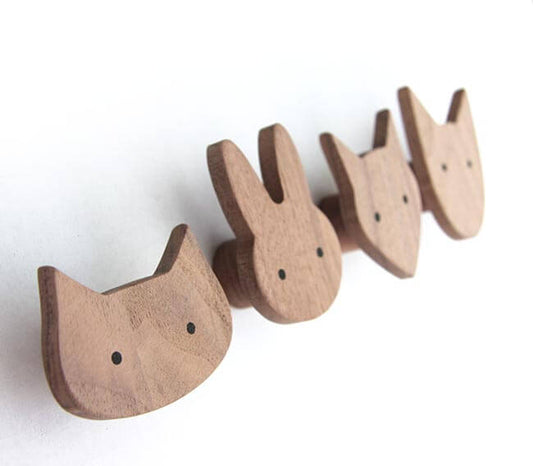 Tier Wandhaken & Schubladengriffe aus WalnussHolz in Skandinavischen Stil Hase Hund Katze Fox