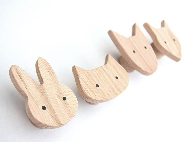 Animal wall hooks & drawer pulls made of wood. Animal hooks made of oak in Scandinavian design. Rabbit dog cat fox
